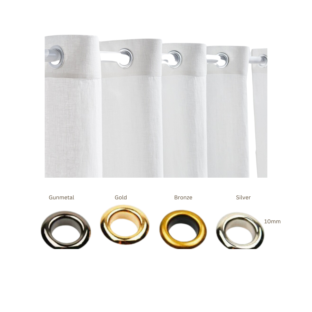 Grommets, available in finishes like silver, antique bronze, gunmetal, and black, are a favored option for modern spaces. They all feature an inner diameter of 1.5 inches, suitable for curtain rods with a diameter of up to 1.3 inches. Should you require a Grommet with a 2-inch diameter, note that this size is only offered in silver and may not always be in stock; we advise contacting us via email to check its availability.